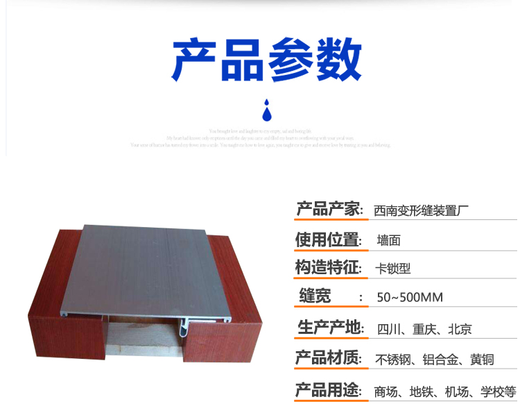 由于外墻變形縫在工程建筑上的影響越來越大,注意其外界影響因素,減輕建筑結(jié)構(gòu)變形縫情況發(fā)生率則顯得尤為重要。我司為了滿足客戶的具體需求還提供定制款服務(wù),下面所示的是工程中常用的墻面變形縫裝置。