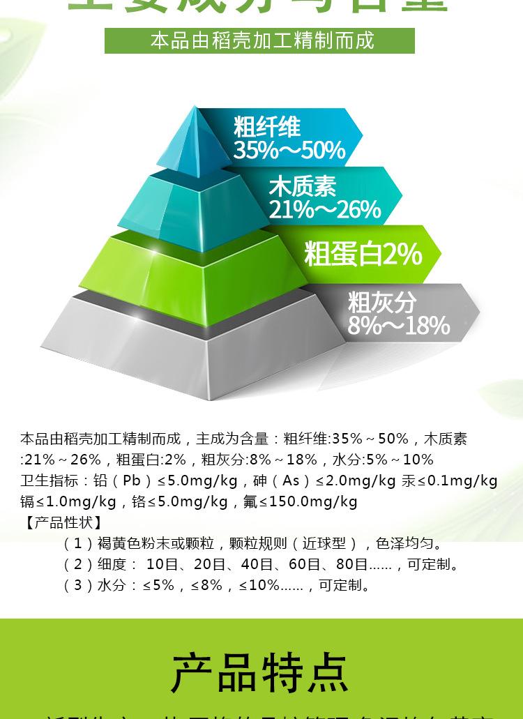 (1)本品由稻殼加工精制而成,主成為含量:粗纖維:35%~50%,木質(zhì)素:21%~26%,粗蛋白:2%,粗灰分:8%~18%,水分:5%~10%