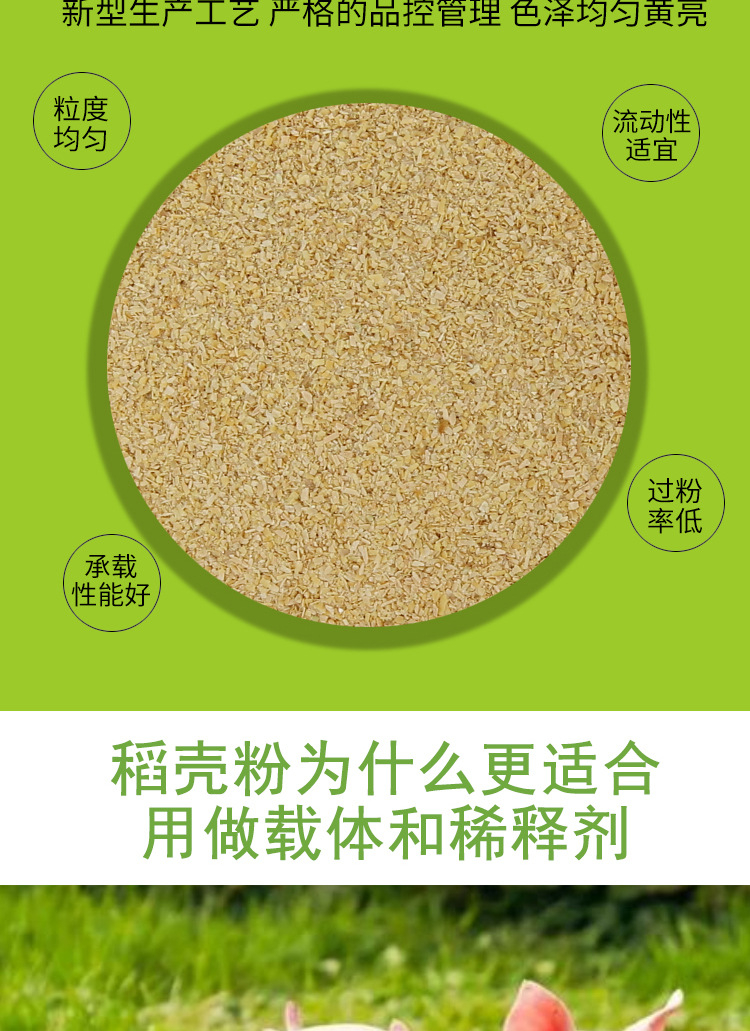 綿陽載微寶科技有限公司根據(jù)飼料添加劑生產(chǎn)過程中對稻殼粉的特殊要求,綜合飼料企業(yè)在生產(chǎn)采購中對飼料載體稀釋劑的各種困惑和難點,研究開發(fā)了專門針對稻殼原料的新型粉碎機,該機克服了球磨粉碎機生產(chǎn)的稻殼粉過粉率高,粒度分布不均勻及錘片式粉碎機所生產(chǎn)的稻殼粉顆粒粗,顆粒形狀差(長條形)等特點,所產(chǎn)精制稻殼粉水分低(特殊烘干工藝),顆粒規(guī)則(主要呈球型),流動性適中,容重較普通稻殼粉有所提高(0.45-0.65),更加接近被承載營養(yǎng)物質(zhì)的容重,混合均勻后不會分級,是非常良好的飼料載體。