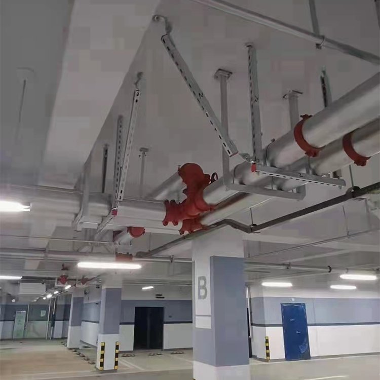 抗震支吊架是以地震力為主要荷載的抗震支撐系統(tǒng),針對的是遭遇到設防烈度的地震時能將管道及設備產(chǎn)生的地震作用傳到結構體上的一種抗震支撐措施??拐鹬У跫苁窃诎惭b工程中將空調(diào)、消防、強電、弱電等各專業(yè)的支吊架綜合在一起,統(tǒng)籌規(guī)劃設計,整合成一個統(tǒng)一的支吊系統(tǒng)。大型室內(nèi)工程的設備、風道、電纜橋架及各類管道的綜合排布與安裝往往會影響到本身及相關專業(yè)的施工進度、觀感和空間的合理利用,而支吊架的選擇與安裝又是決定設備管道綜合排布是否合理、美觀的前提條件。