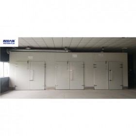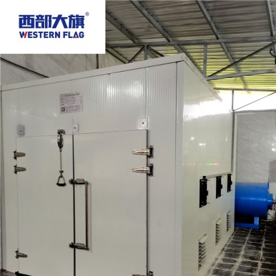 西部大旗冷風(fēng)干燥機(jī)工作過程,是在保溫庫房內(nèi)模擬秋冬季低溫、低濕、高風(fēng)速的自然風(fēng)干環(huán)境,對肉制品進(jìn)行快速低溫脫水干燥,與外界空氣隔絕,衛(wèi)生條件好,無需排濕裝置,運(yùn)行費(fèi)用較熱風(fēng)烘干低,多余的熱量通過水或風(fēng)散至室外,能實(shí)現(xiàn)烘房內(nèi)溫差2℃的恒溫干燥。高效率的風(fēng)機(jī)在閉密的板鴨烘干房內(nèi)循環(huán)通風(fēng),從而形成了強(qiáng)對流區(qū),加上智能控制系統(tǒng)不間斷的工作,使烘房內(nèi)干濕風(fēng)循環(huán)交替,板鴨表面水分隨著干冷風(fēng)的循環(huán)對流而不斷蒸發(fā),排出體外,出現(xiàn)“流汗”現(xiàn)象,然后又迅速被冷風(fēng)吹拂,板鴨體表的水分又迅速被帶走,排到烘干房外部,通過上述過程的反復(fù),板鴨的含水率逐漸減少直至風(fēng)干完成。
