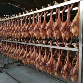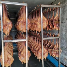 秋高鴨肥,籠中雞胖,轉(zhuǎn)眼又到了秋冬季節(jié),按傳統(tǒng)習(xí)慣,又該準(zhǔn)備灌臘腸、曬臘肉、做板鴨了。板鴨是中國(guó)南方地區(qū)的一道特色名吃,像江蘇南京板鴨、江西南安板鴨 四川建昌板鴨、九尺板鴨、什邡板鴨等。四川板鴨烘干機(jī)生產(chǎn)廠家-西部大旗給大家分享一下板鴨烘干機(jī)的烘干工藝:首先,預(yù)熱階段:快速升溫至75度,工藝時(shí)間設(shè)置為4-5小時(shí),判斷的依據(jù)是表皮起皺紋,發(fā)現(xiàn)物料有滴油的現(xiàn)象。當(dāng)此情況出現(xiàn)時(shí),板鴨的內(nèi)在溫度和烘干房?jī)?nèi)的溫度已經(jīng)基本一致,就需要進(jìn)入等速烘干階段:這個(gè)時(shí)候就可以把溫度降低至65度,工藝時(shí)間依舊設(shè)置為4-5小時(shí),4-5小時(shí)之后,再進(jìn)行下一步減速干燥階段,需求溫度設(shè)定在55度,當(dāng)然,據(jù)工藝需要可以略作調(diào)整,這樣烘干出來(lái)的板鴨色澤鮮亮,烘干品質(zhì)好。按此工藝烘干的話,大約1.6斤鴨子可以烘干出1. 2斤的干貨。若有板鴨烘房建造需求,規(guī)劃板鴨烘房建造用地時(shí),如果掛放兩層,可按照1平方等于50只鴨子計(jì)劃。更多板鴨烘干機(jī)的烘干知識(shí)歡迎來(lái)電垂詢!