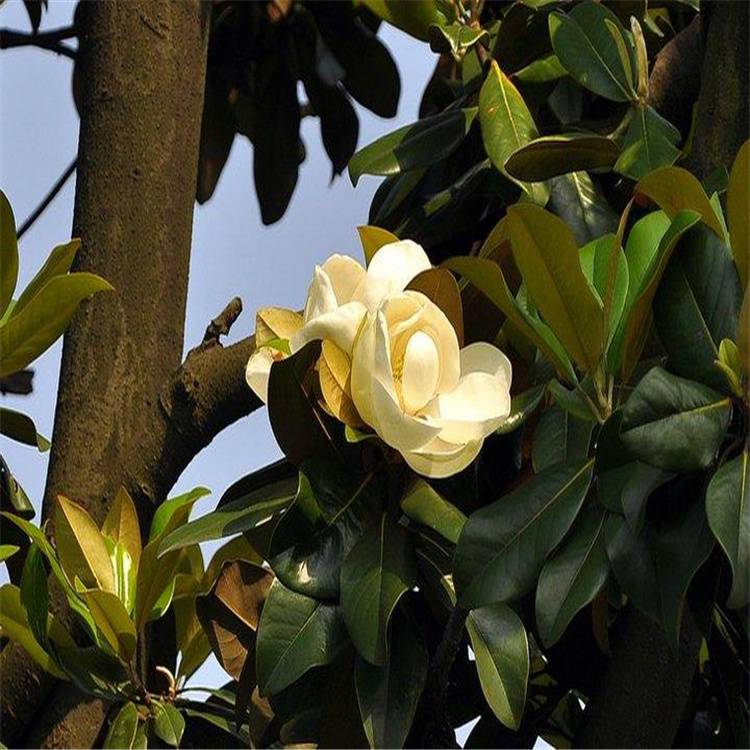 荷花玉蘭(學(xué)名:Magnolia grandiflora L):常綠喬木,在原產(chǎn)地高達(dá)30米;樹(shù)皮淡褐色或灰色,薄鱗片狀開(kāi)裂;小枝粗壯。葉厚革質(zhì),橢圓形,長(zhǎng)圓狀橢圓形或倒卵狀橢圓形,葉面深綠色,有光澤?;ò咨?,有芳香,直徑15-20厘米;花被片9-12,厚肉質(zhì),倒卵形,長(zhǎng)6-10厘米,寬5-7厘米。聚合果圓柱狀長(zhǎng)圓形或卵圓形,蓇葖背裂,背面圓,頂端外側(cè)具長(zhǎng)喙;種子近卵圓形或卵形,長(zhǎng)約14毫米,徑約6毫米,外種皮紅色,除去外種皮的種子,頂端延長(zhǎng)成短頸。花期5-6月,果期9-10月。
