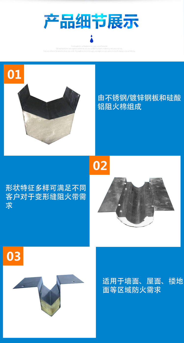 變形縫伸縮縫阻火帶一種為鍍鋅鐵皮及耐火纖維加工而成的,另一種是du高標(biāo)準(zhǔn)的,采用硅zhi酸鋁耐火纖維及不銹鋼薄板加工而成。而不銹鋼薄板,可采用201和304兩種。