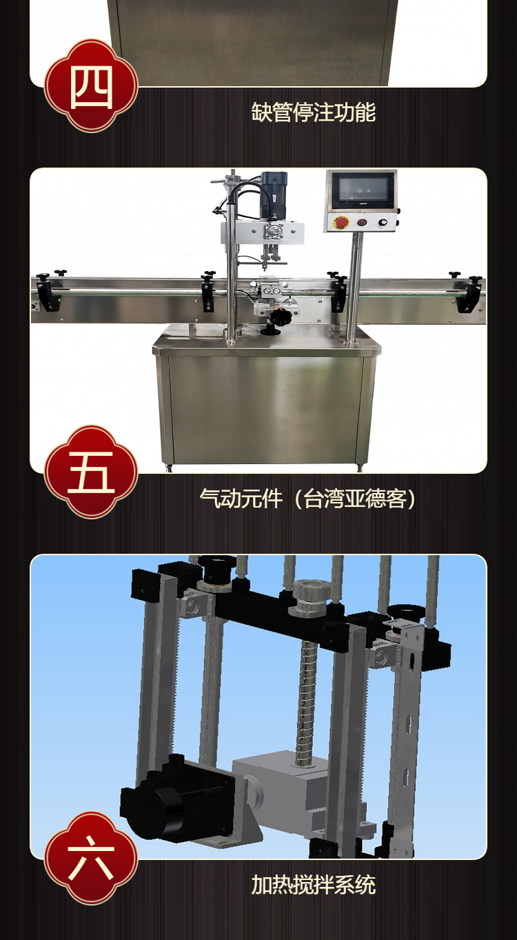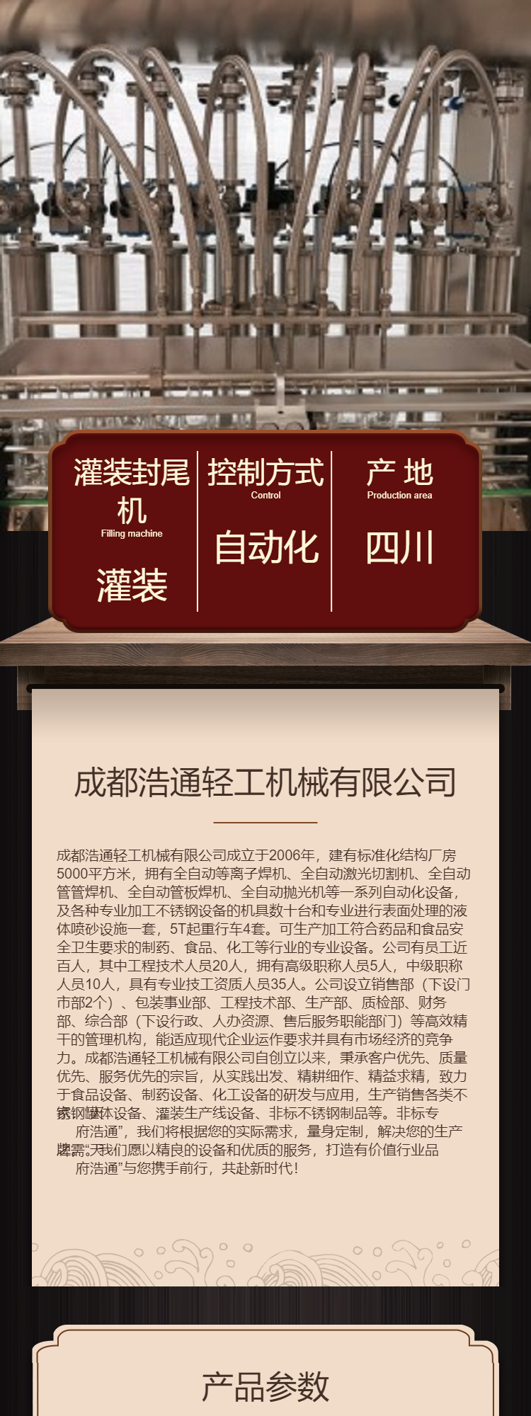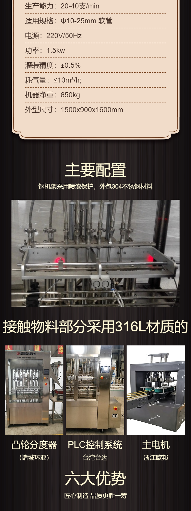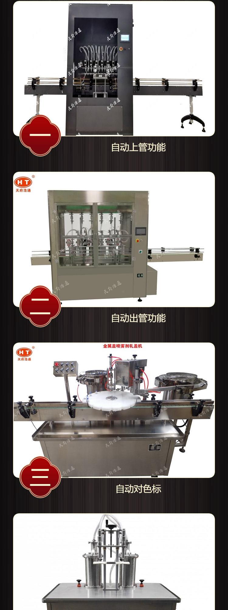 HTG-6型6頭直線式灌裝機直線式適用于制藥、食品、化工、農(nóng)藥等行業(yè)低稠度液體灌裝。該機結(jié)構(gòu)緊湊、合理,外形美觀,能方便與其它設(shè)備聯(lián)動成線。