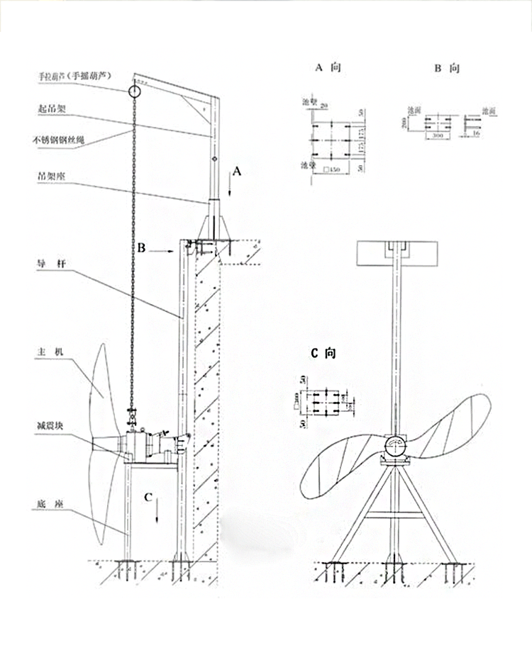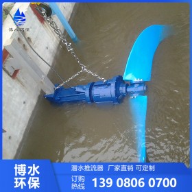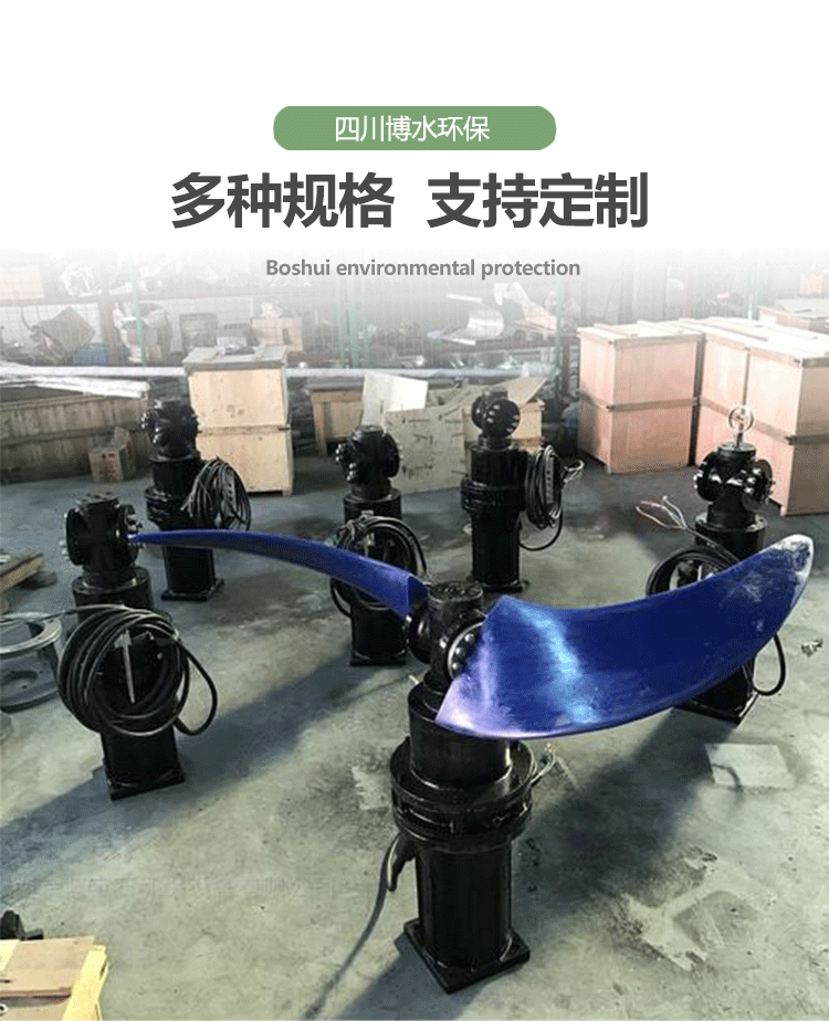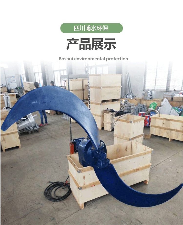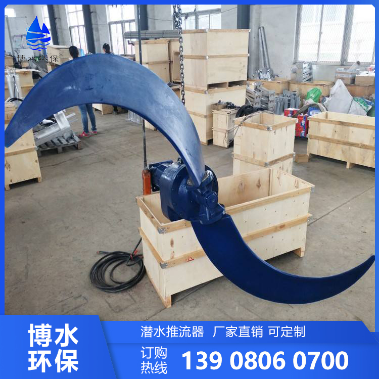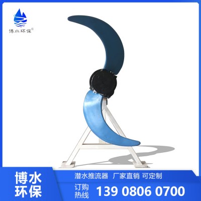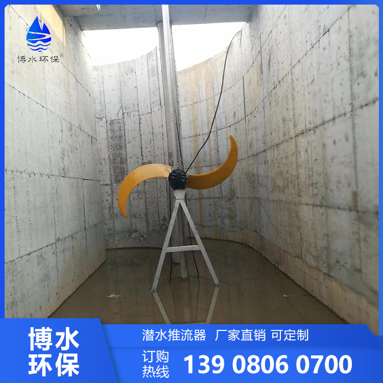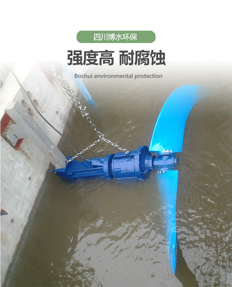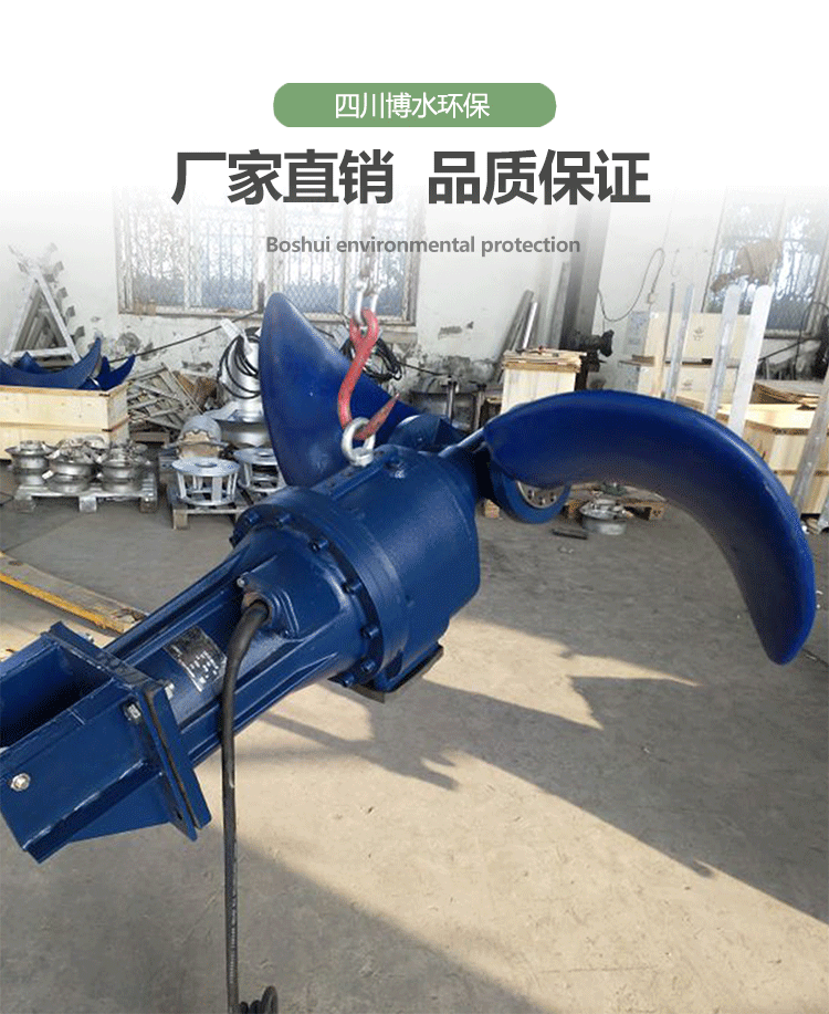 潛水?dāng)嚢铏C(jī)又稱污水處理攪拌機(jī)或潛水?dāng)嚢杵?,是種主要用于污水處理的 攪拌機(jī)械,由港水電機(jī)、密封機(jī)構(gòu)、葉輪(又稱轉(zhuǎn)輪)、電氣控制等組成,通常利用 導(dǎo)桿安裝在水下。潛水?dāng)嚢铏C(jī)葉輪在電機(jī)的驅(qū)動(dòng)下旋轉(zhuǎn),攪拌液體產(chǎn)生旋向時(shí)流, 利用沿著射流表面的剪切應(yīng)力進(jìn)行混合,使射流以外的液體通過摩擦產(chǎn)生攪拌作用,在極度混合的同時(shí),形成體積流,應(yīng)用大體積流動(dòng)模式得到受控液體的攪拌推流輸送,達(dá)到充分混合、防止沉淀及推流的作用。攪拌的效果取決于液體的密度和黏度、水池的體積和形狀以及潛水?dāng)嚢铏C(jī)的功率和效率。當(dāng)水池較大時(shí),需要使用兩臺(tái)或兩臺(tái)以上的潛水?dāng)嚢铏C(jī)。