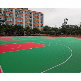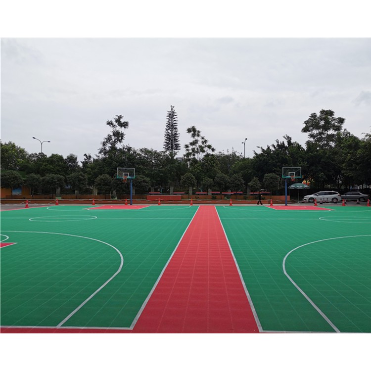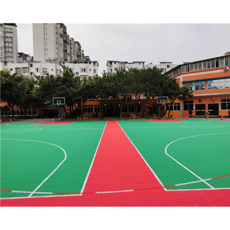 1、 室外運動地板表面為雪花紋落空面,耐沖擊性聚丙烯,多個密集支撐腳。模塊含有彈性鎖扣系統(tǒng),提供機械的水平緩沖性能;