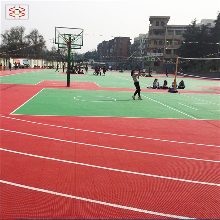 1、 室外運動地板表面為雪花紋落空面,耐沖擊性聚丙烯,多個密集支撐腳。模塊含有彈性鎖扣系統(tǒng),提供機械的水平緩沖性能;