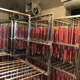 此時(shí),肉制品中水分容易蒸發(fā)和排出的水分差不多都沒有了,余下就是結(jié)分,此時(shí)提高溫度,加快固型,不進(jìn)行排濕處理,時(shí)間控制在一定范圍內(nèi),通過觀察肉制品的變化,適當(dāng)停止烘干機(jī)設(shè)備運(yùn)行,直到成品推出。
