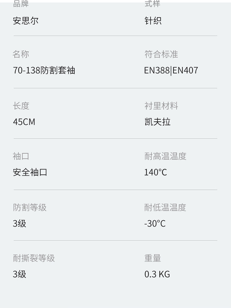 ansell/安思爾70-138 中量型凱夫拉抗割袖筒針織防割袖套防護(hù)護(hù)臂