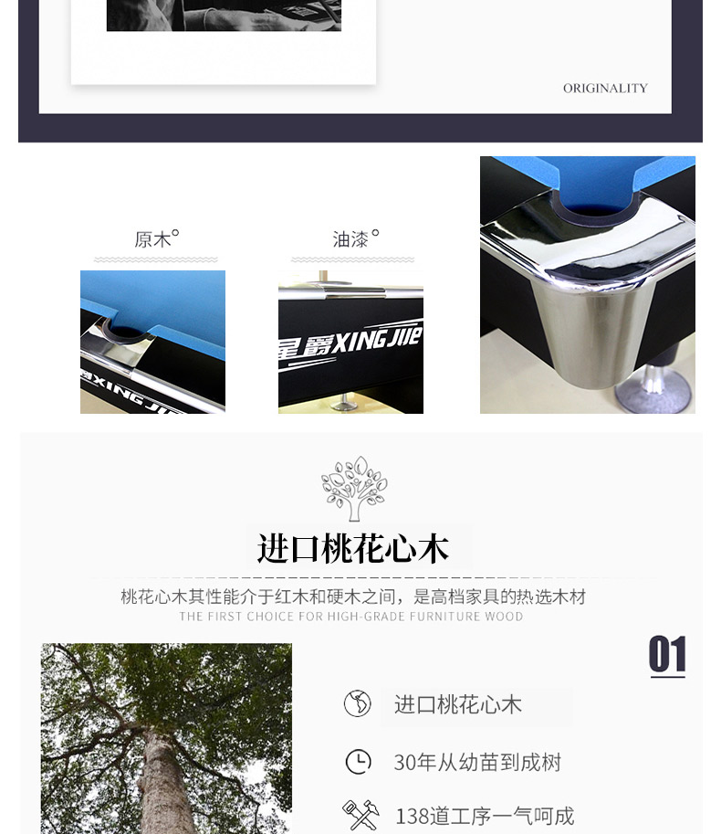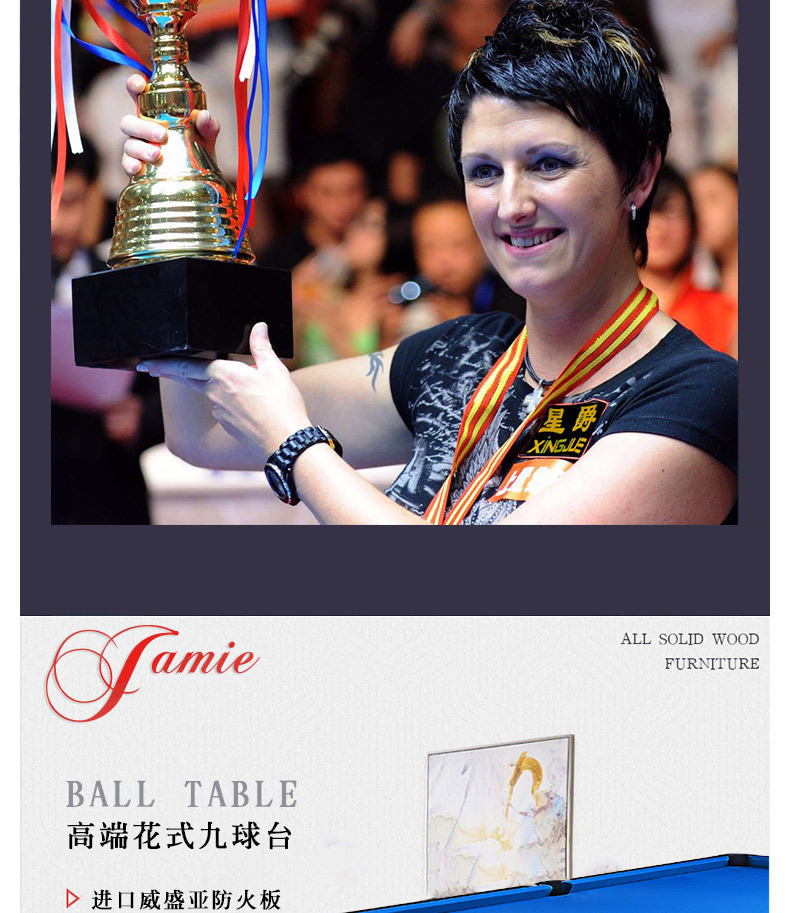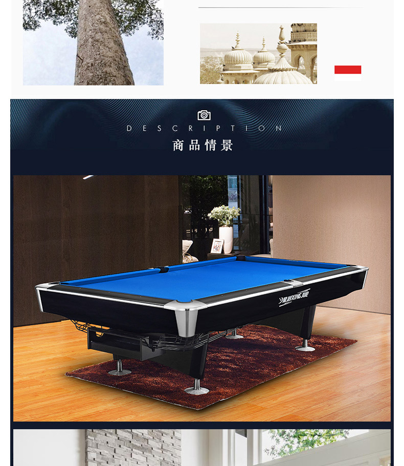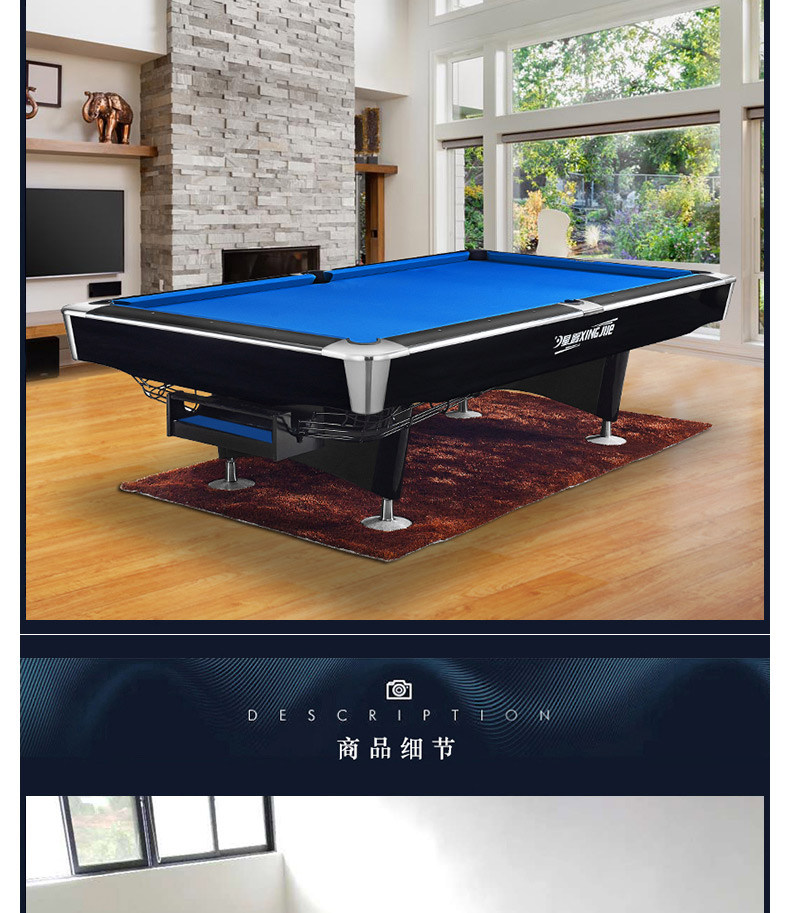 A級(jí)青石板,美國(guó)進(jìn)口防火板,實(shí)木扶手。尺寸:2.03*3.83*0.85米,配置:臺(tái)尼一張,英式球1盒,球桿4支,架桿4支,長(zhǎng)打長(zhǎng)架,巧粉12粒,手套2個(gè),皮頭10粒,膠水1粒,桿架1個(gè),三角框1個(gè)