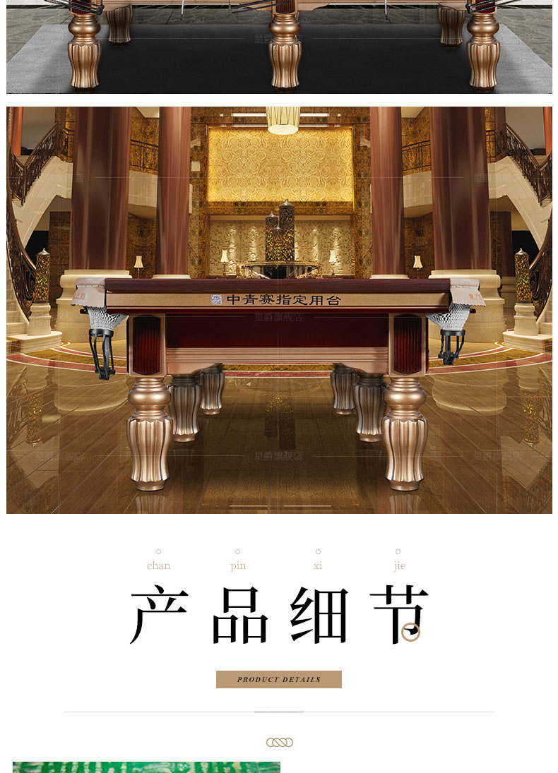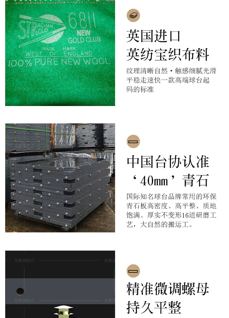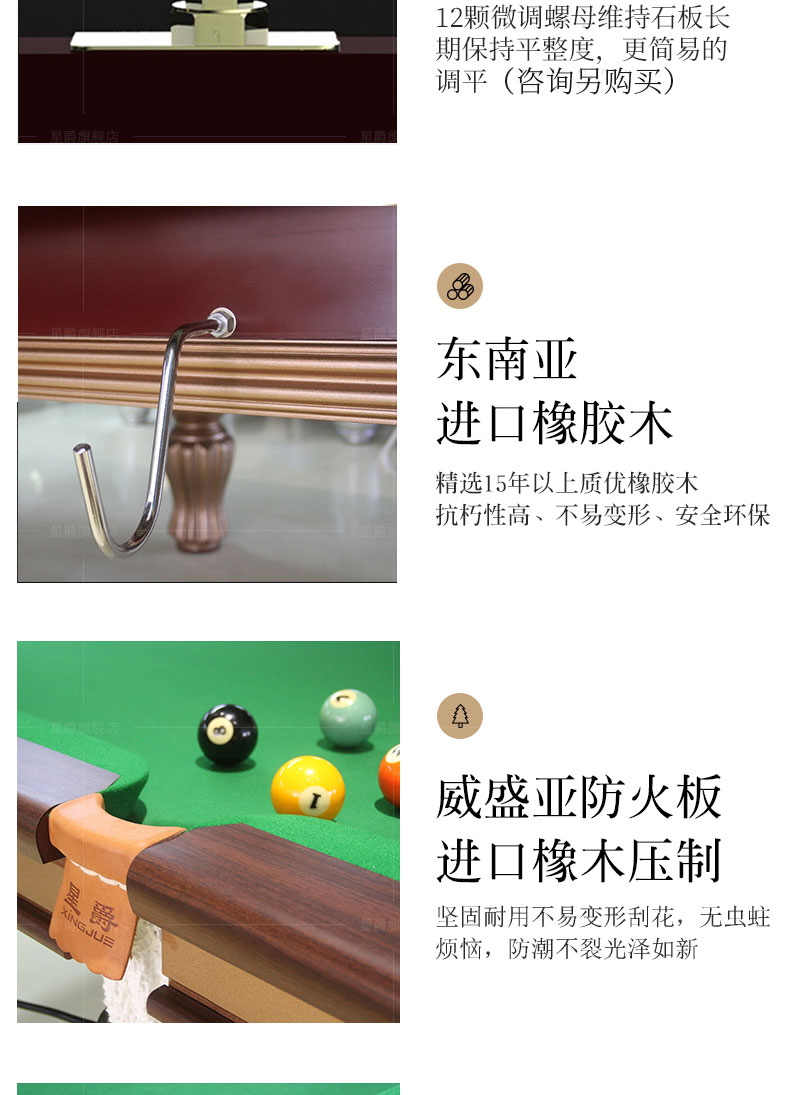 A級(jí)青石板,美國(guó)進(jìn)口防火板,實(shí)木扶手。尺寸:2.03*3.83*0.85米,配置:臺(tái)尼一張,英式球1盒,球桿4支,架桿4支,長(zhǎng)打長(zhǎng)架,巧粉12粒,手套2個(gè),皮頭10粒,膠水1粒,桿架1個(gè),三角框1個(gè)