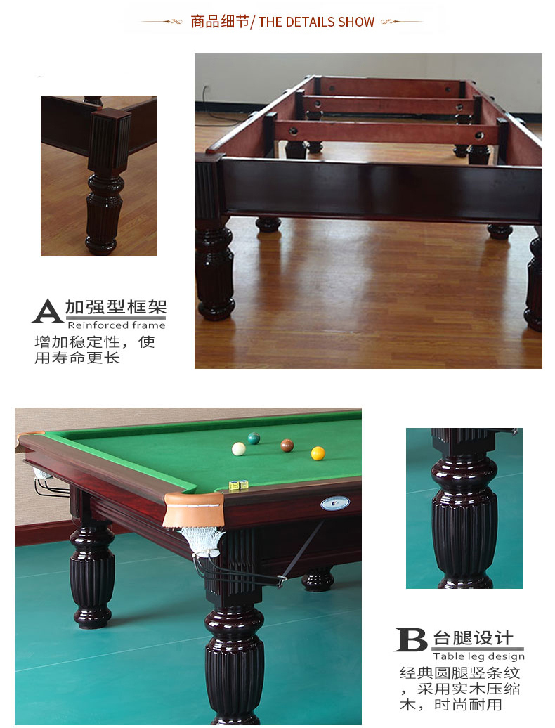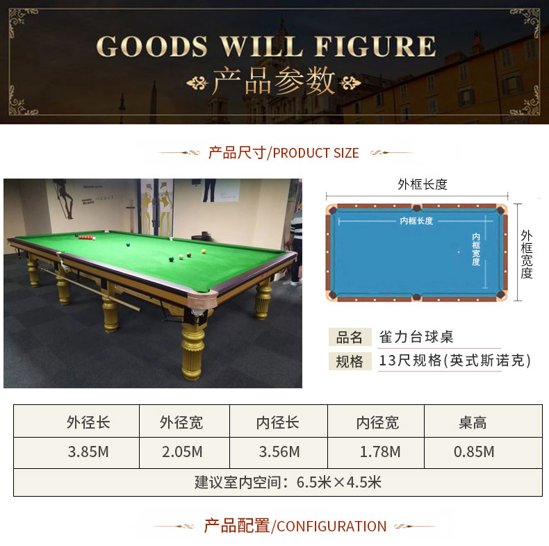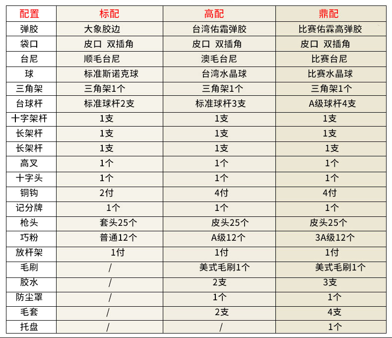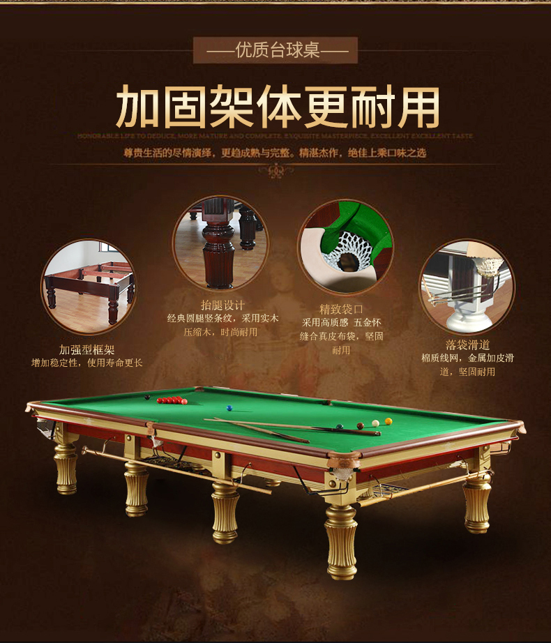 A級(jí)大理石石板,進(jìn)口防火板,實(shí)木扶手。尺寸:2.83*1.55*0.85米,配置:臺(tái)尼一張,美式球1盒,球桿4支,架桿1支,巧粉12粒,手套2個(gè),皮頭10粒,膠水1粒,桿架1個(gè),三角框1個(gè)