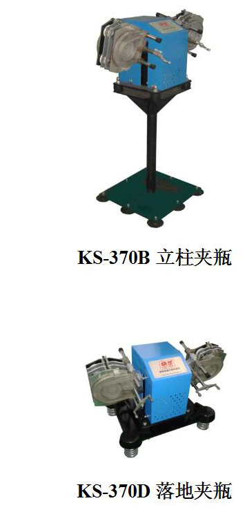 KS-370型涂料快速分散試驗機有立柱式和落地式二種形式,并有夾罐配置和夾瓶配置二種配置,提供客戶多種選擇。立柱式取放物料較方便,落地式較安穩(wěn)。夾罐配置可夾持用戶自備的各種料罐(每側(cè)不超過2.5L,二側(cè)共5L),夾瓶配置帶有小玻璃瓶夾具(每側(cè)可放4個,二側(cè)共八個)。隨機提供的小玻璃瓶每個容積約195mL。