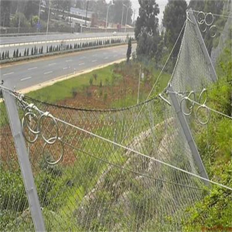 被動(dòng)防護(hù)網(wǎng)由鋼絲繩網(wǎng)或環(huán)形網(wǎng)(需攔截小塊落石時(shí)附加一層鐵絲格柵),固定系統(tǒng)(錨桿、攔錨繩、基座和支撐繩)、減壓環(huán)和鋼柱四個(gè)主要部分構(gòu)成。鋼柱和鋼絲繩網(wǎng)連接組合構(gòu)成一個(gè)整體,對(duì)所防護(hù)的區(qū)域形成面防護(hù),從而阻止崩塌巖石土體的下墜,起到邊坡防護(hù)作用。