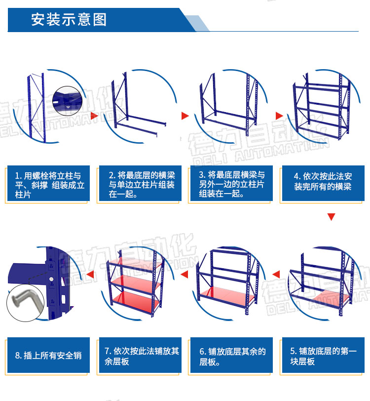 通常均為手工存取貨方法,組裝式結(jié)構(gòu),層間距可自由調(diào)節(jié),貨物也常為集件或不是很重的未包裝物品(即于手工存取),貨架高度通常在2.5m以下,否則手工難以涉及(如輔以登高車則可設(shè)置在3m左右)。單元貨架跨度(便長度)不宜過長,單元貨架深度(便闊度)不宜過深。