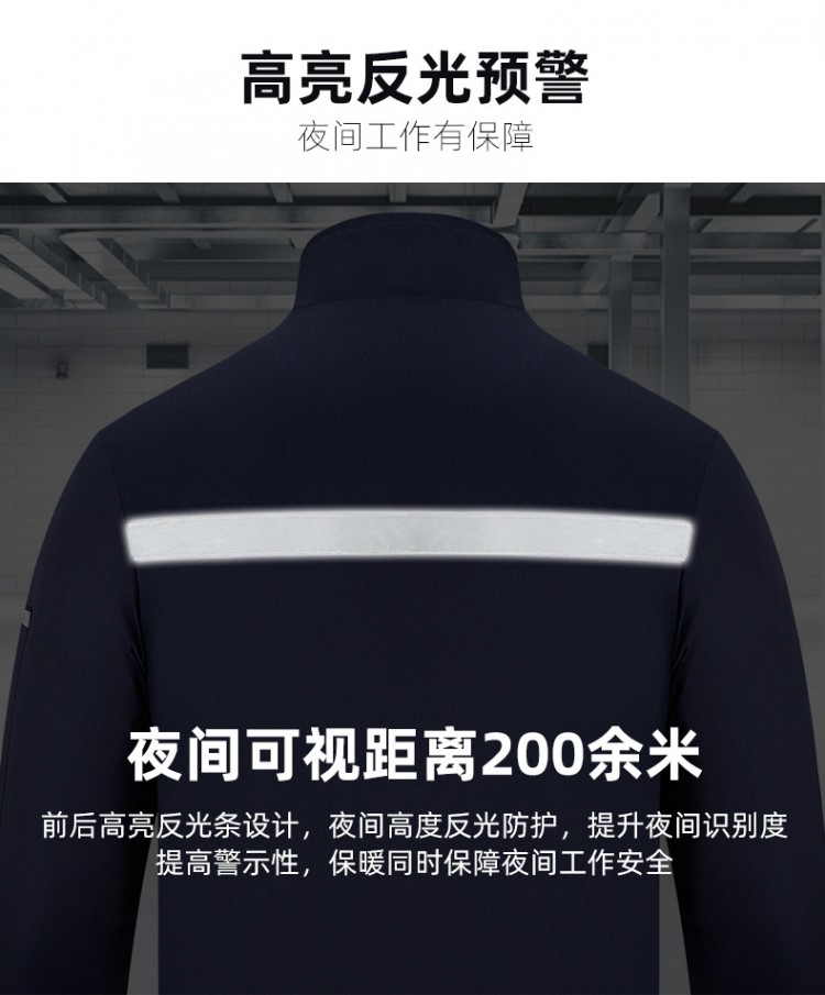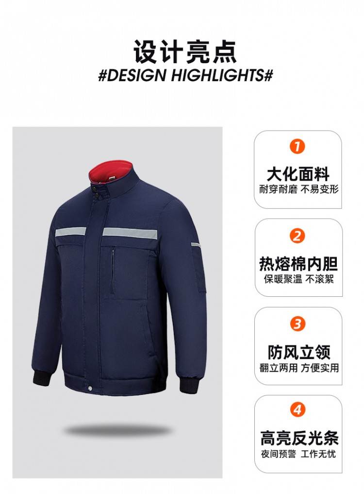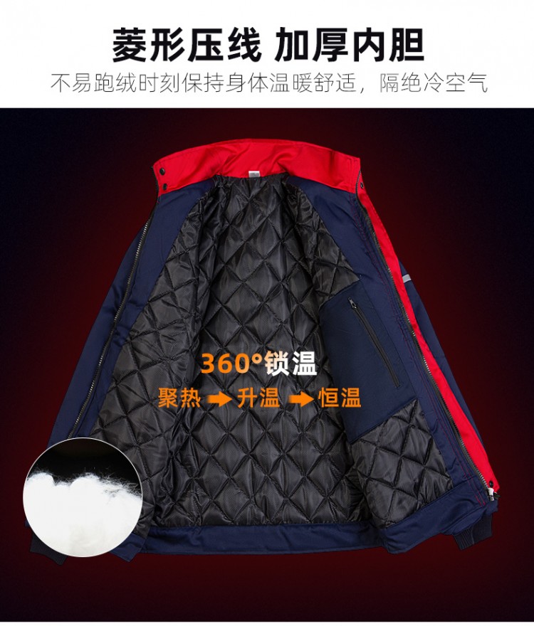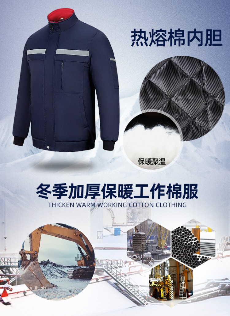 成都棉服廠(chǎng)家:生產(chǎn)工作服棉衣,冬季耐磨加絨加厚防寒反光棉衣,可定制,本款棉衣為全工藝滌棉厚沙卡面料,耐穿耐磨,不易變形,熱熔棉內(nèi)膽,保暖聚溫,不滾絮,防風(fēng)立領(lǐng),翻立兩用,方便實(shí)用,高亮反光條,夜間預(yù)警,工作無(wú)憂(yōu)。內(nèi)膽采用菱形壓線(xiàn),加厚內(nèi)膽,不易跑絨時(shí)刻保持身體溫暖舒適,隔絕冷空氣。前后高亮反光條設(shè)計(jì),夜間高度反光防護(hù) ,提升夜間識(shí)別度提高警示性,保暖同時(shí)保障夜間工作安全。