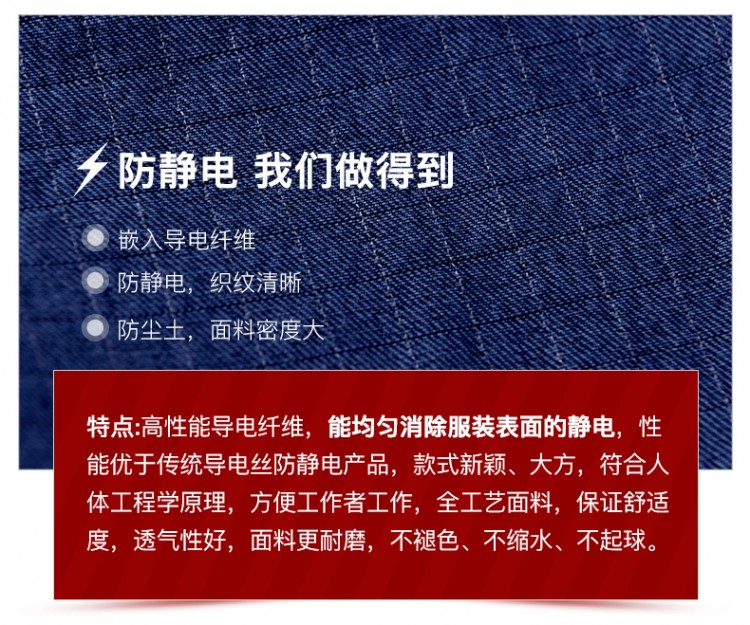 定做工作服:本款服裝采用純棉材質(zhì),結(jié)實(shí)耐磨特種服裝,電子廠防護(hù)服,焊工工作服,全工藝印染,耐臟耐磨,車線工整,寬松版型,不起球,不掉色,專業(yè)防靜電服裝。高性能導(dǎo)電纖維,能均勻消除服裝表面的靜電,性能優(yōu)于傳統(tǒng)導(dǎo)電絲防靜電產(chǎn)品,款式新穎,大方,符合人體工程學(xué)原理,方便工作者工作,全工藝面料,透氣性好,面料更耐磨,不縮水,不起球。