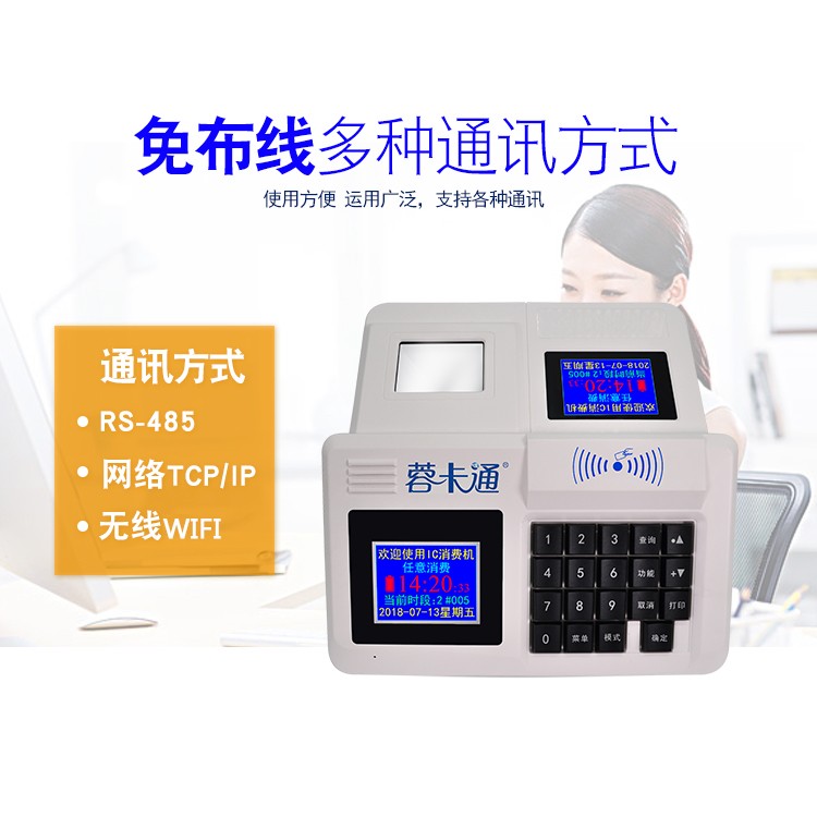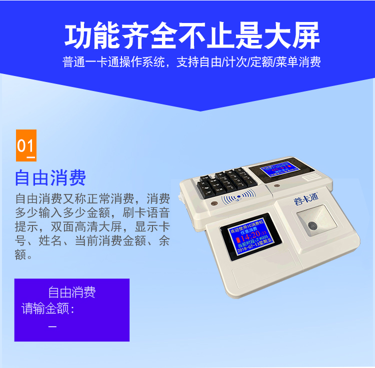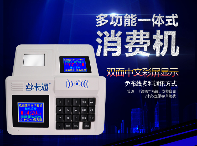 6、雙面顯示窗口:工作人員和消費者可同時查看相同的顯示內容,可顯示消費方式、剩余金額。營業(yè)收入統計方法簡單,直接在消費機上按“*”鍵可知道本消費機的銷售收入和消費人次。