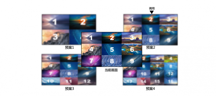 高清畫面分割器提供16種用戶自定義的輸出畫面模式方案,在客戶端可以輕松管理預案的調(diào)用與管理。
