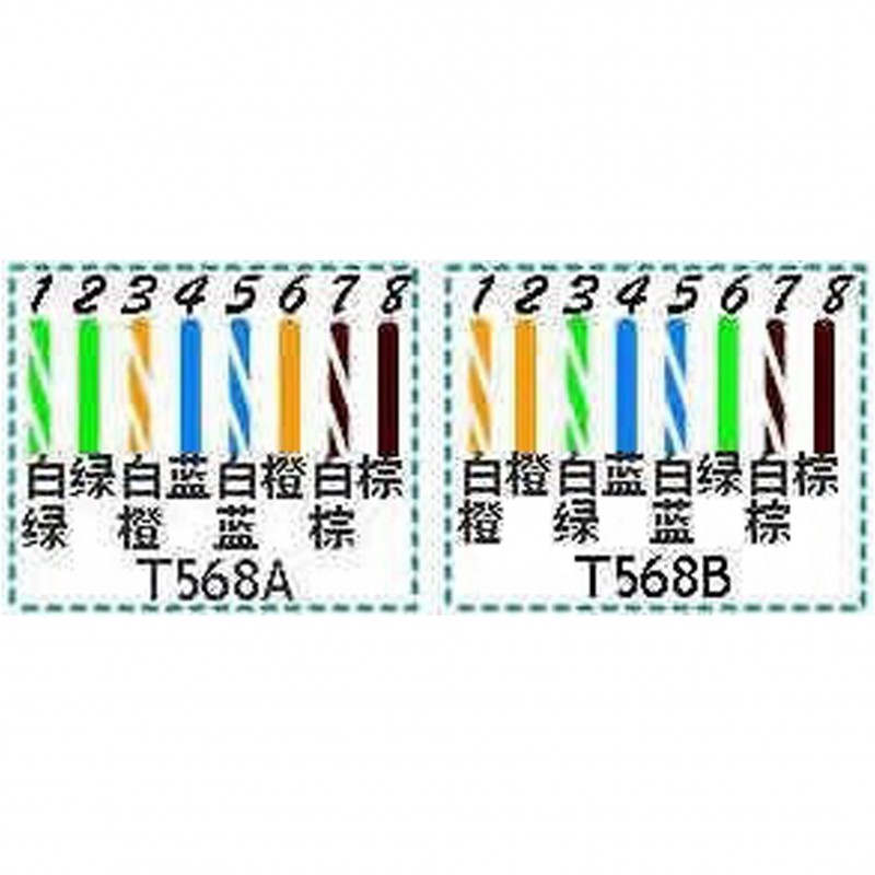 568A 標(biāo)準(zhǔn):白綠,綠,白橙,藍(lán),白藍(lán),橙,白棕,棕 568B 標(biāo)準(zhǔn):白橙,橙,白綠,藍(lán),白藍(lán),綠,白棕,棕
