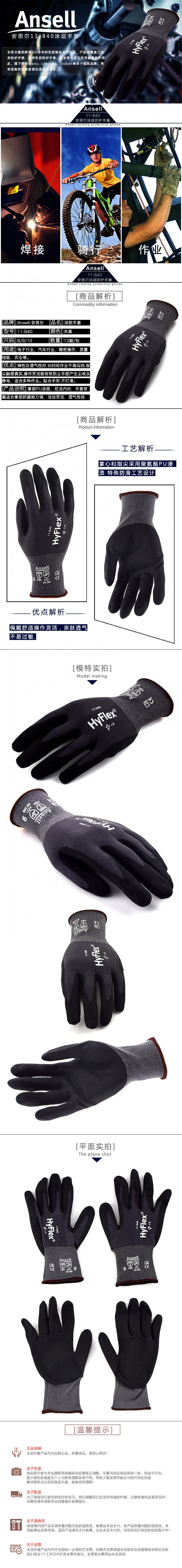 ansell/安思爾11-840 黑色發(fā)泡丁腈涂層 手套耐磨款手套涂膠耐油手套 電力機械汽車加工等行業(yè)適用