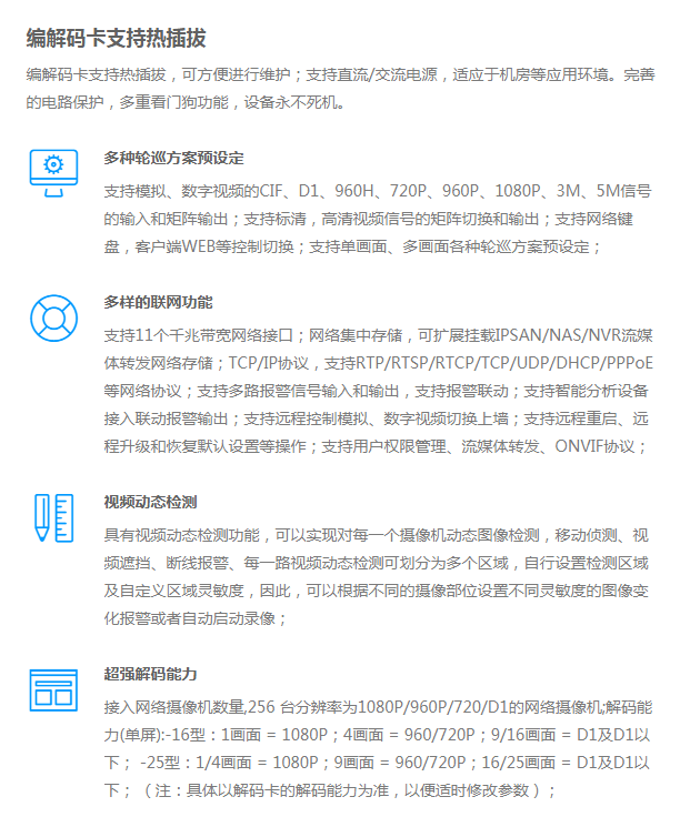伯奧克系列網(wǎng)絡解碼矩陣可以將前端高清網(wǎng)絡攝像機、模擬攝像機信號通過網(wǎng)絡傳輸將視頻數(shù)據(jù)解碼輸出至高清監(jiān)視器、大屏等,通過網(wǎng)絡矩陣控制鍵盤、平臺客戶端實現(xiàn)對高清、標清視頻圖像調(diào)用控制、預覽支持CS/BS模式預覽及控制,可實現(xiàn)流媒體轉(zhuǎn)發(fā)、權限分配、電子地圖、實現(xiàn)圖像畫面任意分割,預案調(diào)用等顯示方式,實現(xiàn)實時語音對講,報警聯(lián)動輸出等功能。本系統(tǒng)應用于高清矩陣系統(tǒng)解決方案中,系統(tǒng)采用LINUX操作系統(tǒng),穩(wěn)定性強、本產(chǎn)品功能完善、穩(wěn)定可靠、操作簡單,適合于高清大屏圖像解碼上電視墻的網(wǎng)絡視頻監(jiān)控場合。