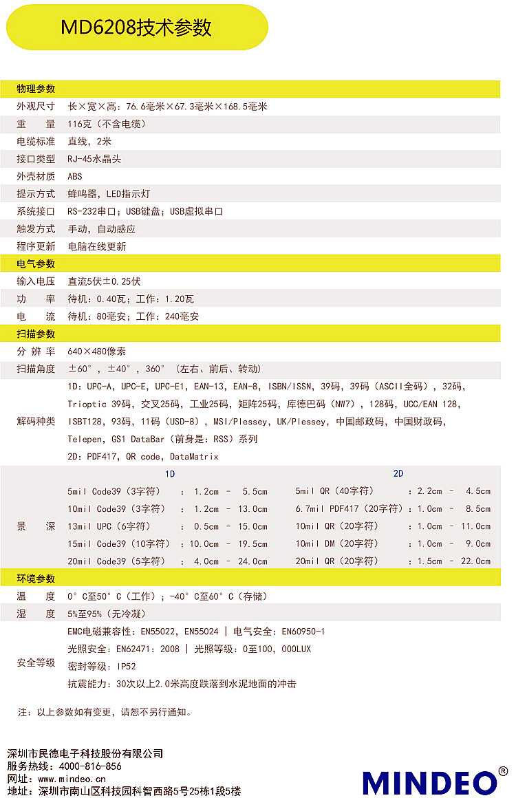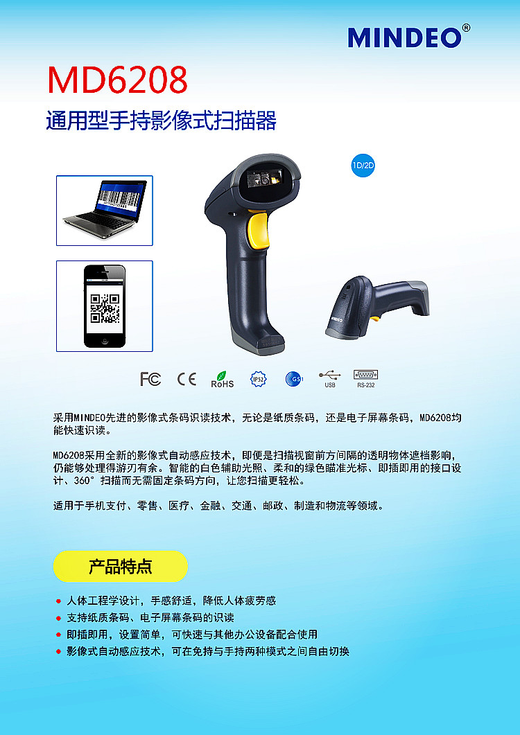 民德MINDEO MD6208高精度掃描槍農(nóng)資1d二d多功能條碼器