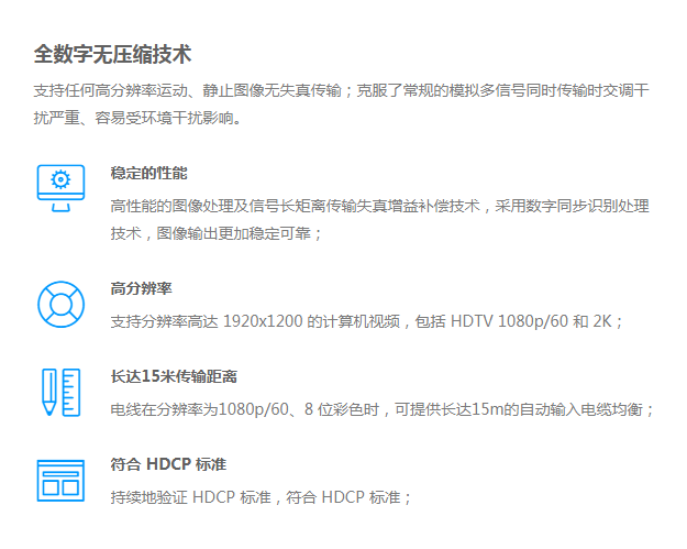 x1200的PC分辨率。HDMI分配器系列采用兩種獨(dú)有的技術(shù):EDID管理器,可在已連接的設(shè)備間保持持續(xù)的EDID通信,可持續(xù)地驗(yàn)證所有設(shè)備間的HDCP加密,確保信號(hào)源內(nèi)容同時(shí)分配至所有顯示設(shè)備。HDMI分配器系列非常適用于需要將一路HDMI源信號(hào)分配至多臺(tái)顯示設(shè)備的應(yīng)用環(huán)境。