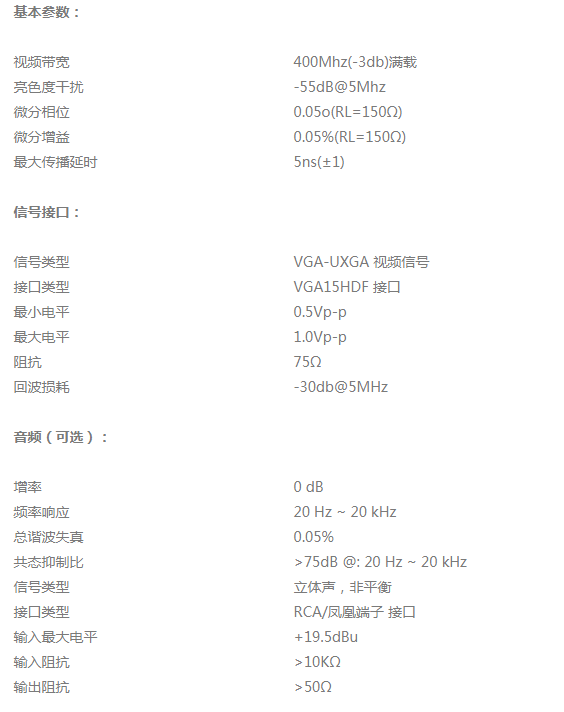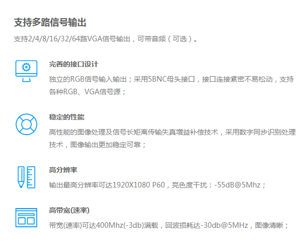 VGA分配器是一款高性能的專業(yè)PC信號分配設備,用于將VGA信號分配復制為多路RGB信號,提供獨立的VGA信號輸入、輸出端子,每路信號單獨傳輸,單獨切換,使信號傳輸衰減降至極低,圖像信號能高保真輸出。 VGA分配器是專門為計算機高分辨率VGA信號的顯示分配而設計的高性能寬帶設備,該系列產(chǎn)品可廣泛應用于大屏幕投影顯示工程 、電化教學、指揮控制中心、多媒體會議室等場合。