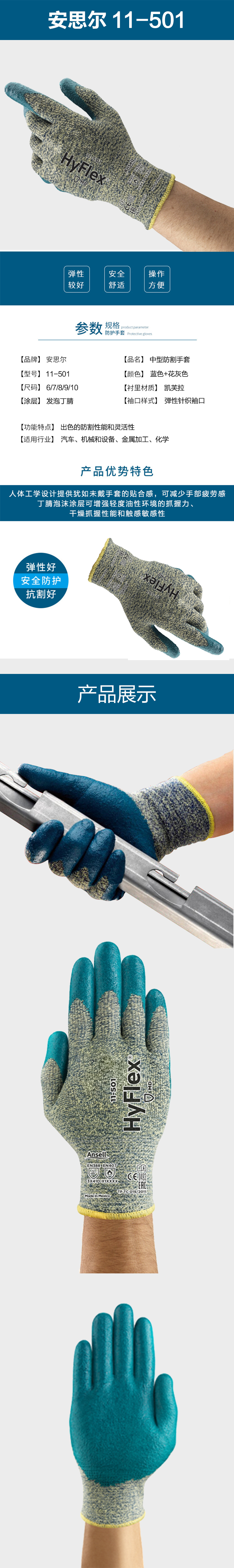 ansell/安思爾11-501 發(fā)泡丁腈涂層防割手套裝配焊接工業(yè)操作手套