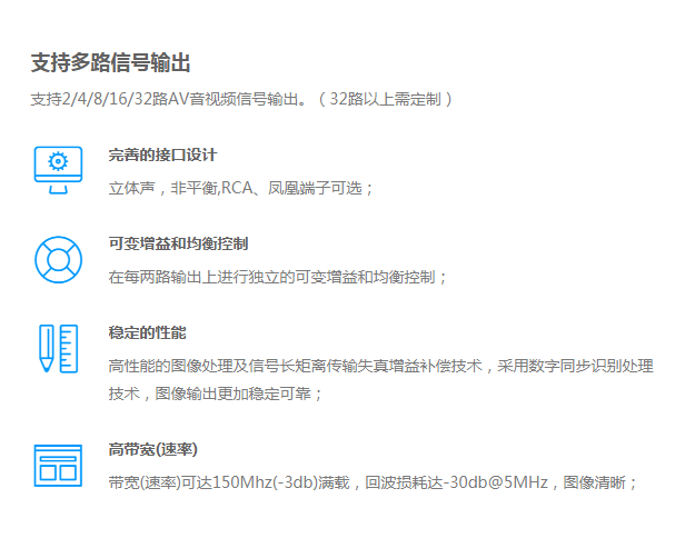 AV分配器系列是高性能分配放大器,設(shè)計(jì)用于分割并延長(zhǎng)復(fù)合視頻和音頻信號(hào),并在確保信號(hào)源的品質(zhì)和強(qiáng)度的情況下將其在長(zhǎng)距離電 纜上進(jìn)行傳輸。電路采用兩級(jí)高頻放大及一級(jí)射極跟隨器的放大電路,能夠使輸入信號(hào)圖像得到更加穩(wěn)定清晰的傳輸。AV分配器可用于VOD視頻點(diǎn)播、影院劇院、電視節(jié)目制作、視頻監(jiān)控系統(tǒng)、多媒體會(huì)議室、電化教學(xué)系統(tǒng)、控制中心、展廳、音視頻系統(tǒng)會(huì)議室等場(chǎng)合,是適合于通訊、攝像及監(jiān)控系統(tǒng)的配套產(chǎn)品。