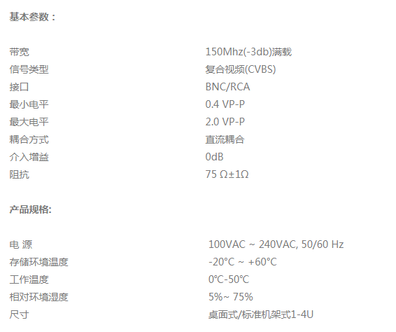 視頻分配器是一款高性能分配放大器,用于分配多路視頻信號。視頻分配器可把多路完全獨(dú)立的復(fù)合視頻輸入信號分配成多組視頻輸出信號。經(jīng)分配輸出的每一路視頻信號的帶寬、峰值電壓和輸出阻抗與本組的視頻輸入的信號格式相一致。視頻分配器由獨(dú)立隔離補(bǔ)償三極管對組成的電路向多個75歐姆負(fù)載輸出信號。它具有彩色黑白兼容和頻率響應(yīng)平坦的特性。機(jī)箱既可機(jī)架安裝也可桌面安裝和機(jī)架式安裝。視頻分配器適用于KTV點(diǎn)歌臺、VOD視頻點(diǎn)播、影院劇院、電視節(jié)目制作、音視頻監(jiān)控系統(tǒng)、多媒體會議室、電化教學(xué)系統(tǒng)、控制中心、展廳、A/V系統(tǒng)會議室等場合。