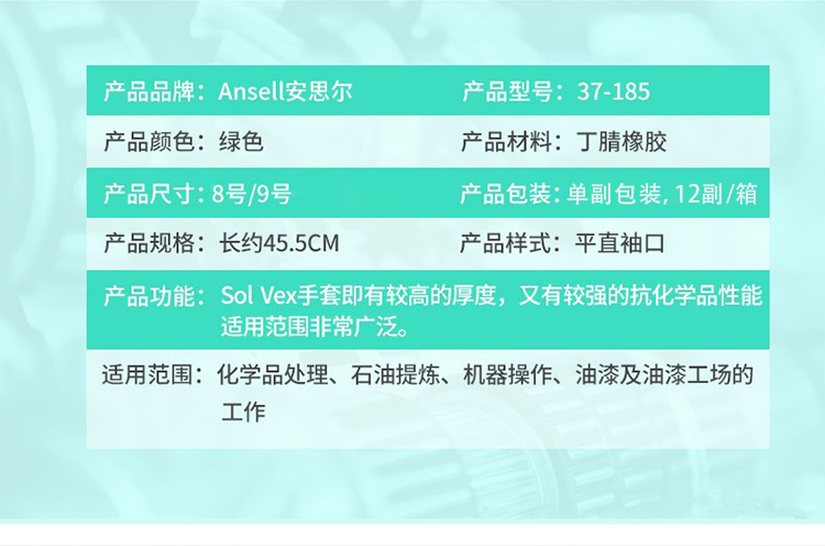 ansell/安思爾37-185 丁腈防化手套 SOL-VEX 抗溶劑丁腈橡膠手套