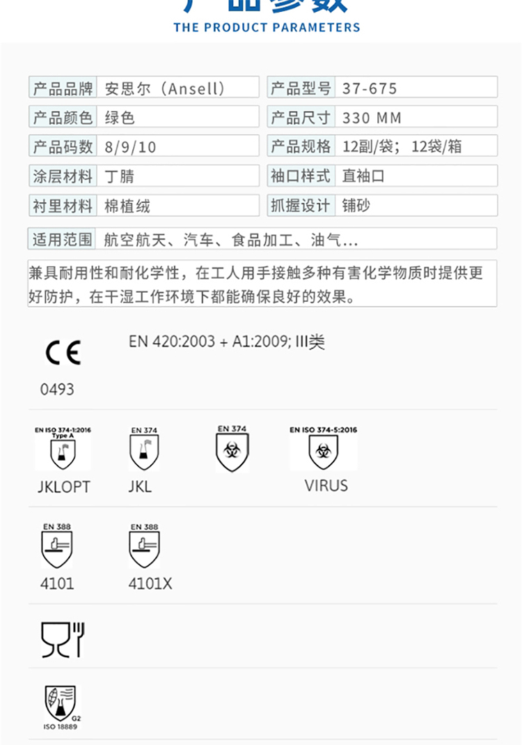 ansell/安思爾37-675 防化防水耐油植絨棉食品級(jí)丁腈手套