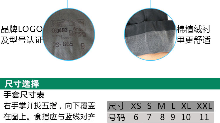 Neoprene 手套由氯丁橡膠構(gòu)成,棉植絨增加舒適性,提高了手套的硬度以增加其耐化學(xué)品及抗磨損性。