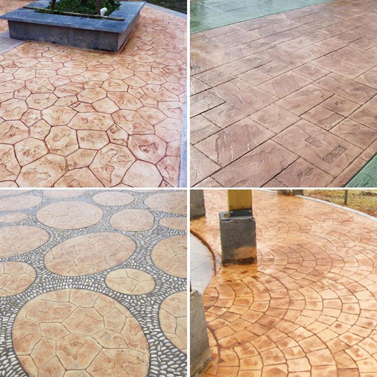 5、使用藝術(shù)地坪模具對地坪面層進(jìn)行紋理處理。藝術(shù)地坪模具應(yīng)配套使用,首先確定好紋理的分布方向,選好一塊模具放置的位置和角度,然后其它的模具依次緊貼一塊模具放置。彩色混凝土藝術(shù)地坪壓模采用壓模,壓模應(yīng)由技術(shù)較好的人員進(jìn)行作業(yè)以保證壓紋深度一致和模具放置的準(zhǔn)確性。