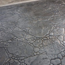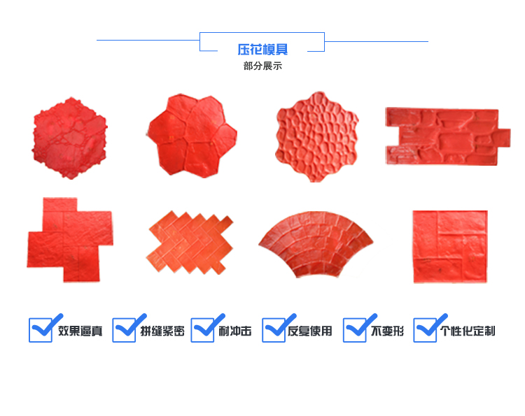 5、使用藝術(shù)地坪模具對地坪面層進行紋理處理。藝術(shù)地坪模具應(yīng)配套使用,首先確定好紋理的分布方向,選好一塊模具放置的位置和角度,然后其它的模具依次緊貼一塊模具放置。彩色混凝土藝術(shù)地坪壓模采用壓模,壓模應(yīng)由技術(shù)較好的人員進行作業(yè)以保證壓紋深度一致和模具放置的準確性。