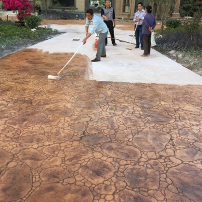5、使用藝術(shù)地坪模具對地坪面層進(jìn)行紋理處理。藝術(shù)地坪模具應(yīng)配套使用,首先確定好紋理的分布方向,選好一塊模具放置的位置和角度,然后其它的模具依次緊貼一塊模具放置。彩色混凝土藝術(shù)地坪壓模采用壓模,壓模應(yīng)由技術(shù)較好的人員進(jìn)行作業(yè)以保證壓紋深度一致和模具放置的準(zhǔn)確性。