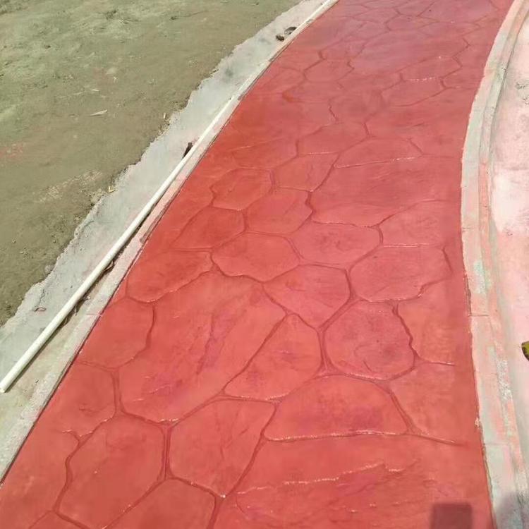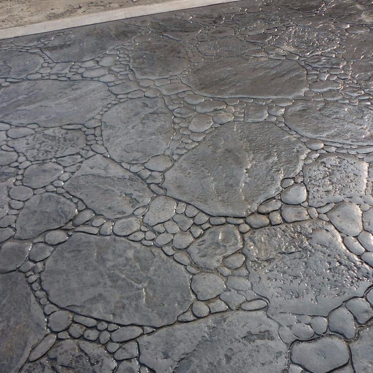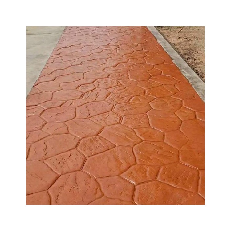 5、使用藝術(shù)地坪模具對(duì)地坪面層進(jìn)行紋理處理。藝術(shù)地坪模具應(yīng)配套使用,首先確定好紋理的分布方向,選好一塊模具放置的位置和角度,然后其它的模具依次緊貼一塊模具放置。彩色混凝土藝術(shù)地坪壓模采用壓模,壓模應(yīng)由技術(shù)較好的人員進(jìn)行作業(yè)以保證壓紋深度一致和模具放置的準(zhǔn)確性。