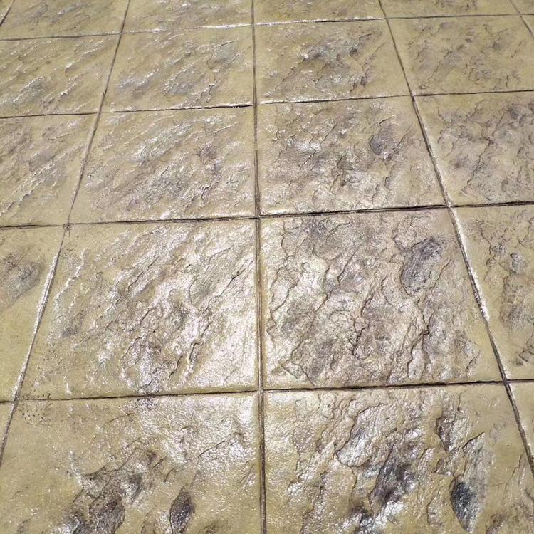 5、使用藝術(shù)地坪模具對地坪面層進(jìn)行紋理處理。藝術(shù)地坪模具應(yīng)配套使用,首先確定好紋理的分布方向,選好一塊模具放置的位置和角度,然后其它的模具依次緊貼一塊模具放置。彩色混凝土藝術(shù)地坪壓模采用壓模,壓模應(yīng)由技術(shù)較好的人員進(jìn)行作業(yè)以保證壓紋深度一致和模具放置的準(zhǔn)確性。