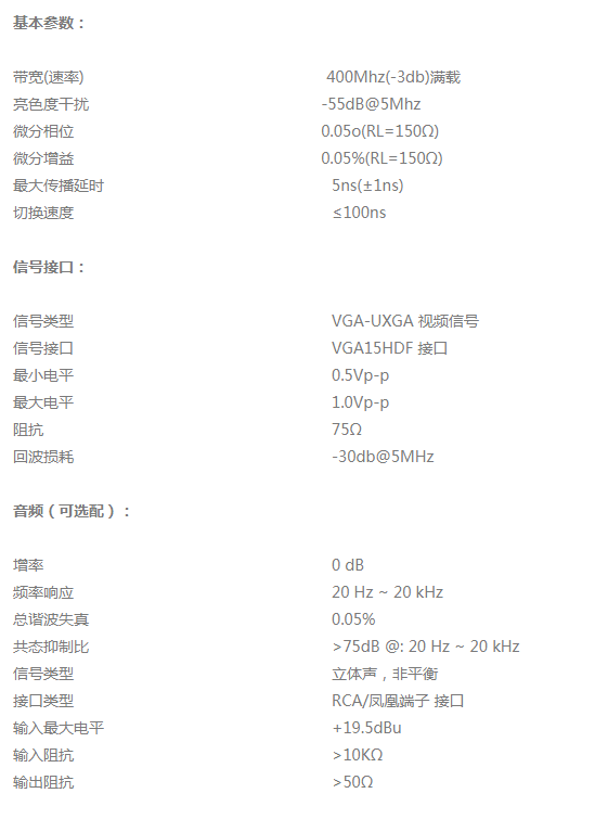 伯奧克VGA系列矩陣切換器是一款高性能的專業(yè)VGA信號(hào)切換設(shè)備,用于多個(gè)VGA信號(hào)輸入輸出交叉切換??商峁┒嗦稸GA信號(hào)輸入、輸出端子,每路信號(hào)都可以自由的進(jìn)行傳輸,切換,信號(hào)傳輸衰減降至極低,圖像信號(hào)能高保真輸出。伯奧克VGA矩陣支持從4x4至32x32不等的輸入/輸出尺寸,提供寬帶切換功能,通過(guò)15針HD插座實(shí)現(xiàn)各類計(jì)算機(jī)視頻的便捷連接。所有型號(hào)都支持通過(guò)螺絲鎖定器輸出平衡或非平衡立體聲音頻。使用預(yù)端接電纜組件可以省卻壓接操作,使安裝過(guò)程更為快速便捷。