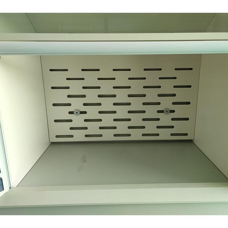 2.上部柜體:排氣柜采用頂罩式抽氣設計,設計有1個∮250mm排風口。導流板采用同質PP材料制作,耐酸堿性能優(yōu)異。安裝尺寸科學合理,無氣流死角,獲取廢氣捕捉性能。