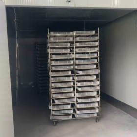 1、將食用菌一層層均勻擺放至托盤(pán)后,放入不銹鋼物料車,將物料車推入食用菌烘干房,烘干時(shí)的溫度應(yīng)從35℃開(kāi)始,如果溫度過(guò)高,排濕跟不上,容易引起食用菌變形。