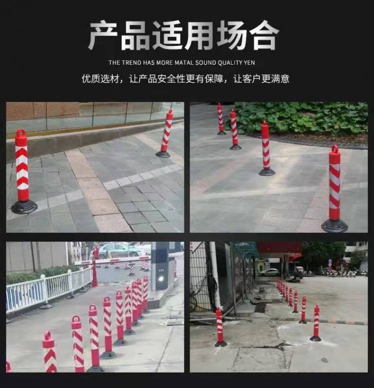 反光彈性警示柱又名反光標(biāo)志、反光柱、柔性柱、標(biāo)柱、彈力柱等,是一款集多種用途的產(chǎn)品。主體采用PE材料配以橡膠底座制作而成,款式新穎且設(shè)計(jì)獨(dú)特,獨(dú)有的傾復(fù)功能可以保護(hù)產(chǎn)品的耐用,如遭遇車輛撞擊后不易造成對(duì)車輛表面的損壞,獨(dú)有的環(huán)型頂部使之移動(dòng)方便并且能隨意自由搭配各種警示連桿及警示鏈條或者警戒帶以起到隔離的作用。