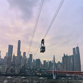 前者在循環(huán)運(yùn)轉(zhuǎn)并形成閉合環(huán)的鋼絲繩兩側(cè),等間距各掛若干個(gè)貨廂,一側(cè)貨廂載貨,另一側(cè)貨廂空載,鋼絲繩既承載又牽引。