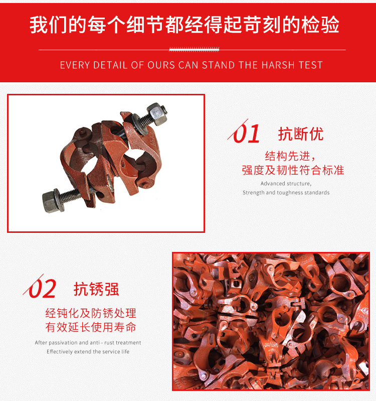 用途:鋼管扣件指兩根鋼管的連接件。用于外徑為48mm的鋼管腳手架固定,保持軌距和阻止鋼軌相對于軌枕的縱橫向移動。