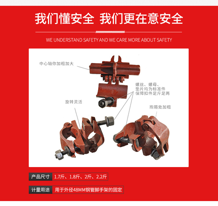 鋼管扣件一般指連接兩根鋼管的中間連接零件,在建筑工程中多用于對外徑為48mm的鋼管腳手架的固定,扣件分為直角扣件(十字扣件、定向扣件)、旋轉(zhuǎn)扣件(活動扣件、萬向扣件)、對接扣件(一字扣件、直接扣件)等。