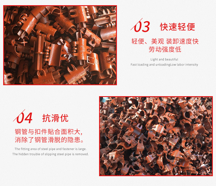 優(yōu)勢作用:扣件具有足夠的強度,耐久性,和一定的彈性,可以有效的保持鋼軌與軌枕之間的可靠聯(lián)結(jié)。此外,扣件系統(tǒng)零件少,安裝簡單,便于拆卸建筑扣件是在建筑施工中。