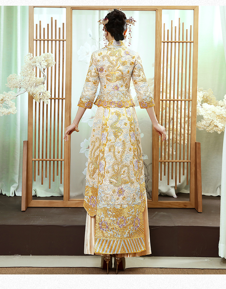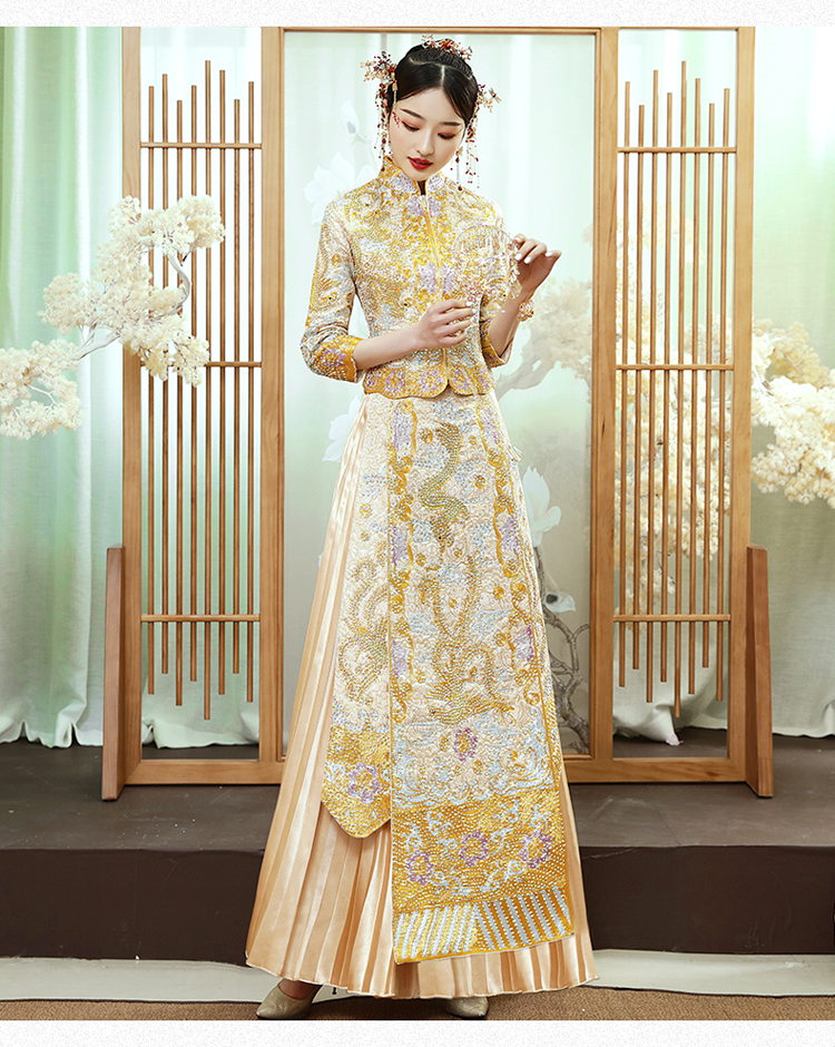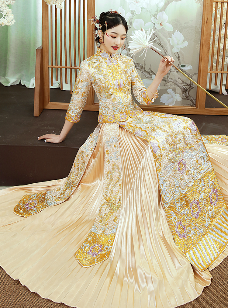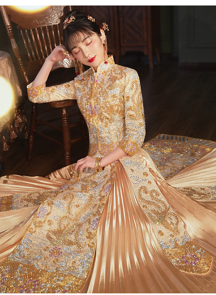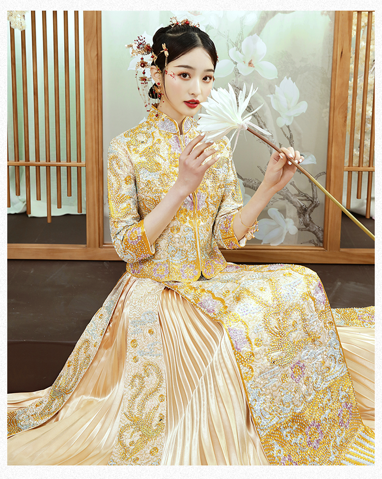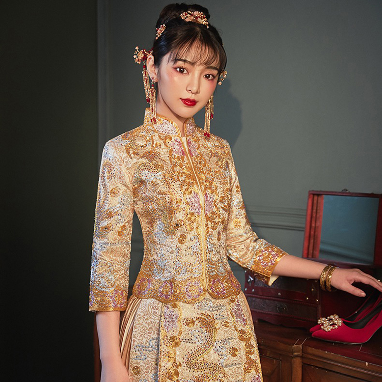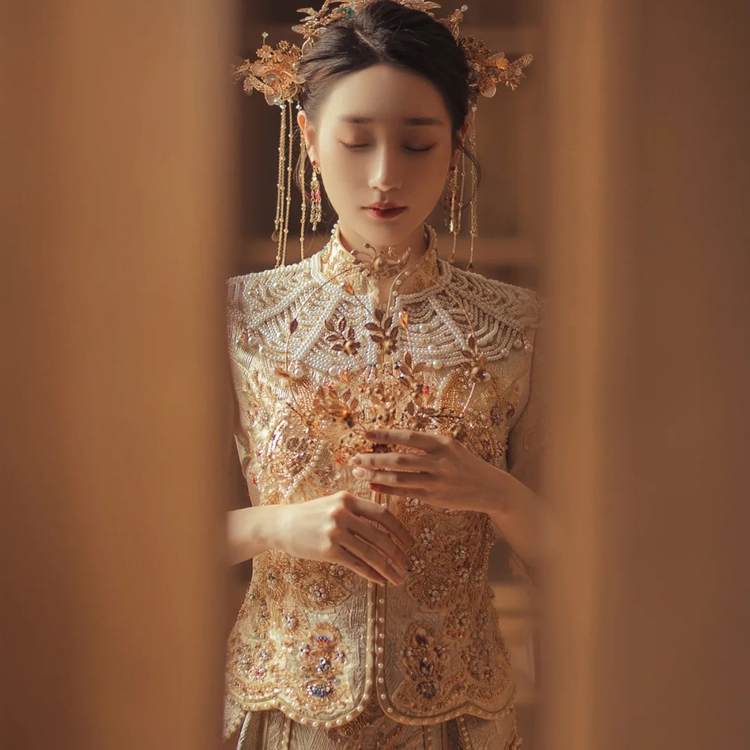 中式的華服是溫軟的綢緞,是藝術品般精美的刺繡,是精巧的立領和盤扣,是簡潔典雅的直線裁剪。一件定制的中式嫁衣,不但是一件寄托幸福的婚禮服,更是一件有生命力的藝術品,值得代代珍藏。傳承,是中式嫁衣獨有的魅力。秀禾服,是嫁衣中獨有的中國情懷。